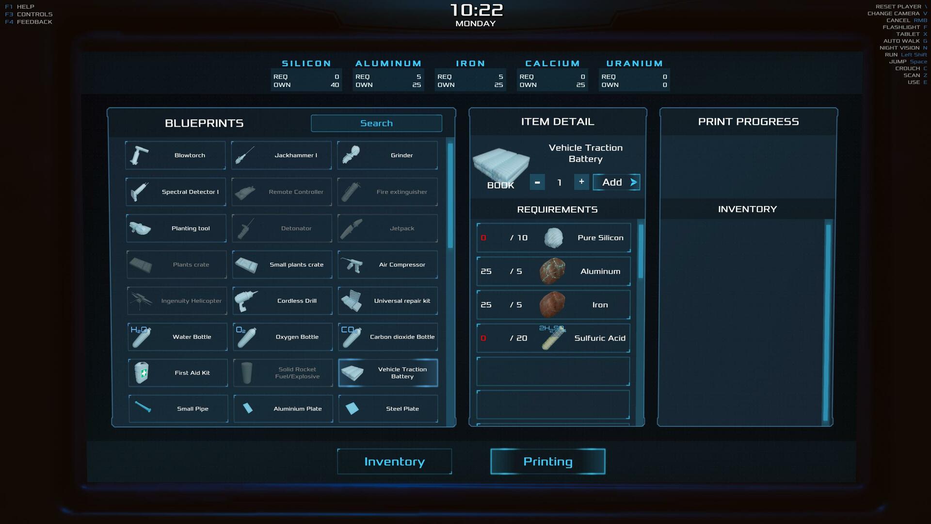 | the icons are extremely hard to discern even though their very large size. the level of the tool can not be seen because no color is used in items. the best discernable items are ore, which are colored. if you can just color all the items, they would be very quickly recognizable without training. that blue pseudo wire frame icon might have looked cool in the beginning, but is very bad in practice with this many very similar items. also, the shades are incorrect. building material is usually blue, but for some reason screws are not. | 30.74 | 2026-02-19 21:01:54 | |||