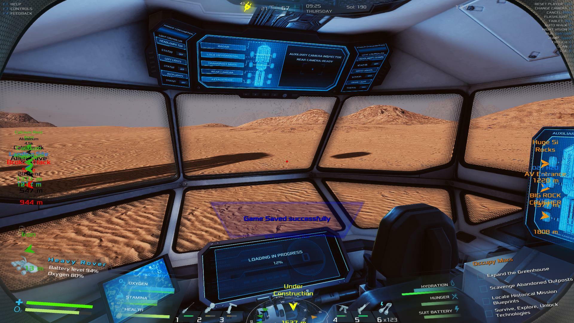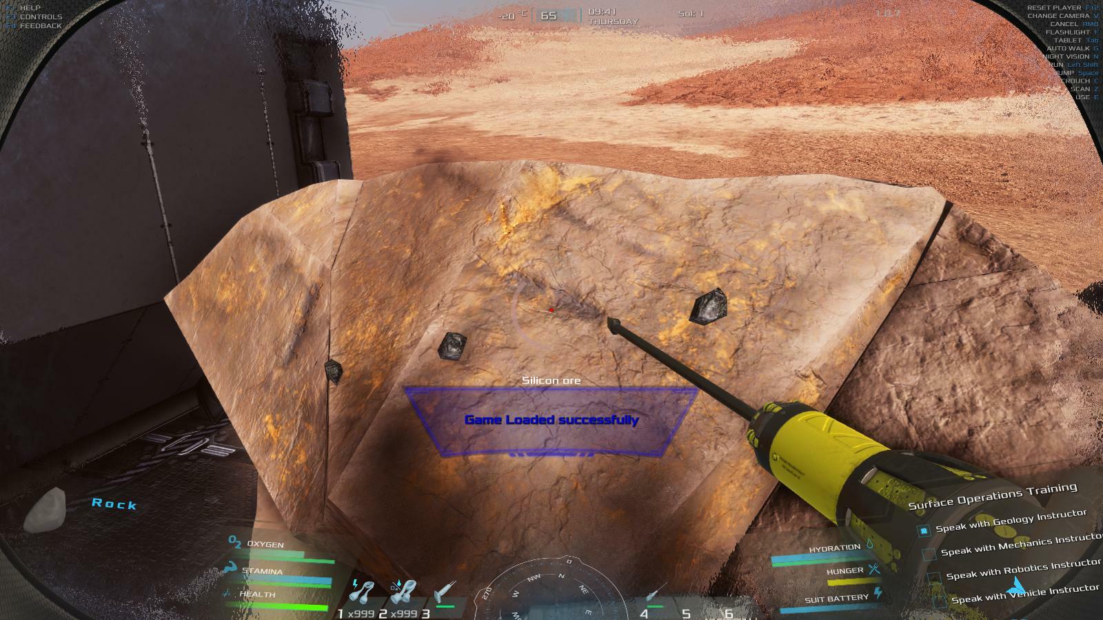 | Several problems with this save file. First, the grabber on my rover stopped working. The reticule is always green and it won't pick up any rocks. Resetting the rover or reloading the game doesn't fix it. I can pick the rocks up manually and place them in the rover's tipper but that is tedious. However, that problem has been superseded now by the fact that when I saved and loaded this latest save my rover has disappeared altogether. | 59.88 | 2026-02-13 07:15:57 | |||